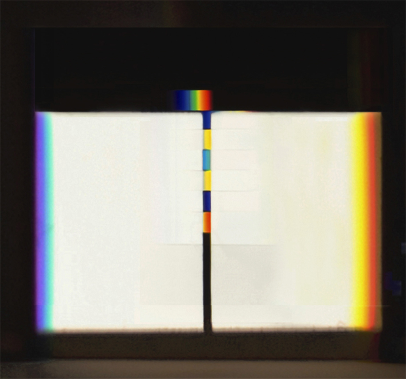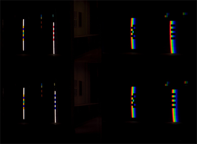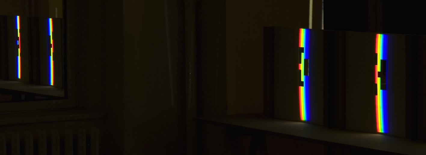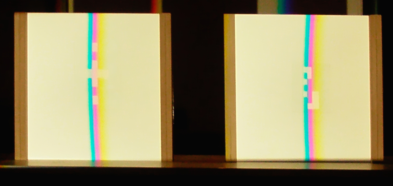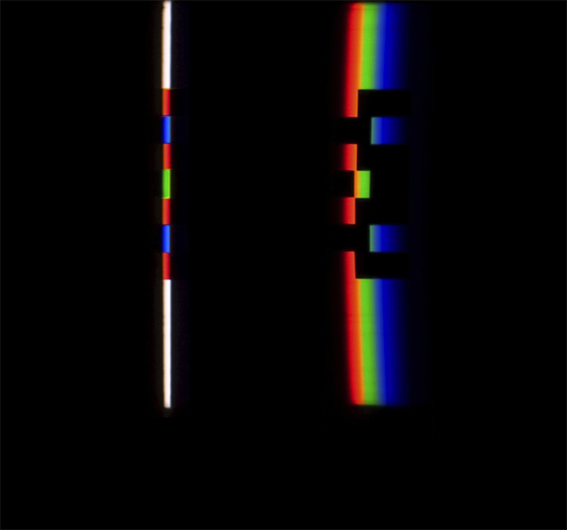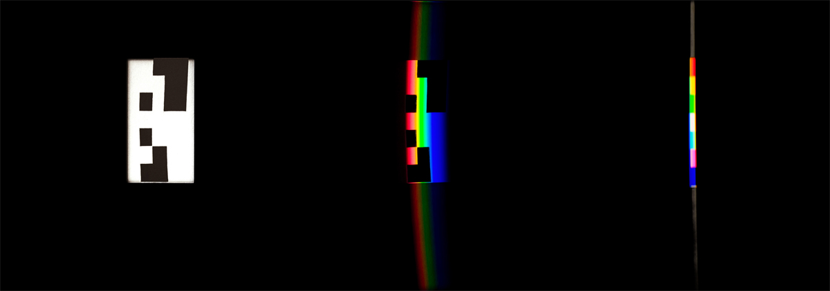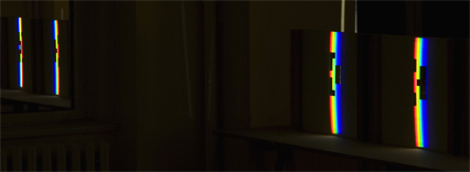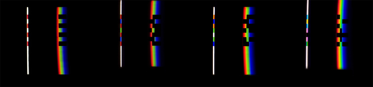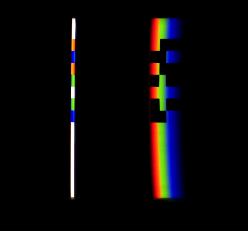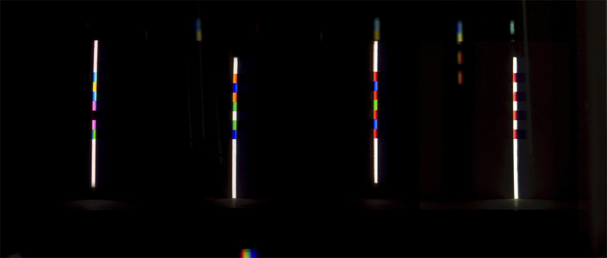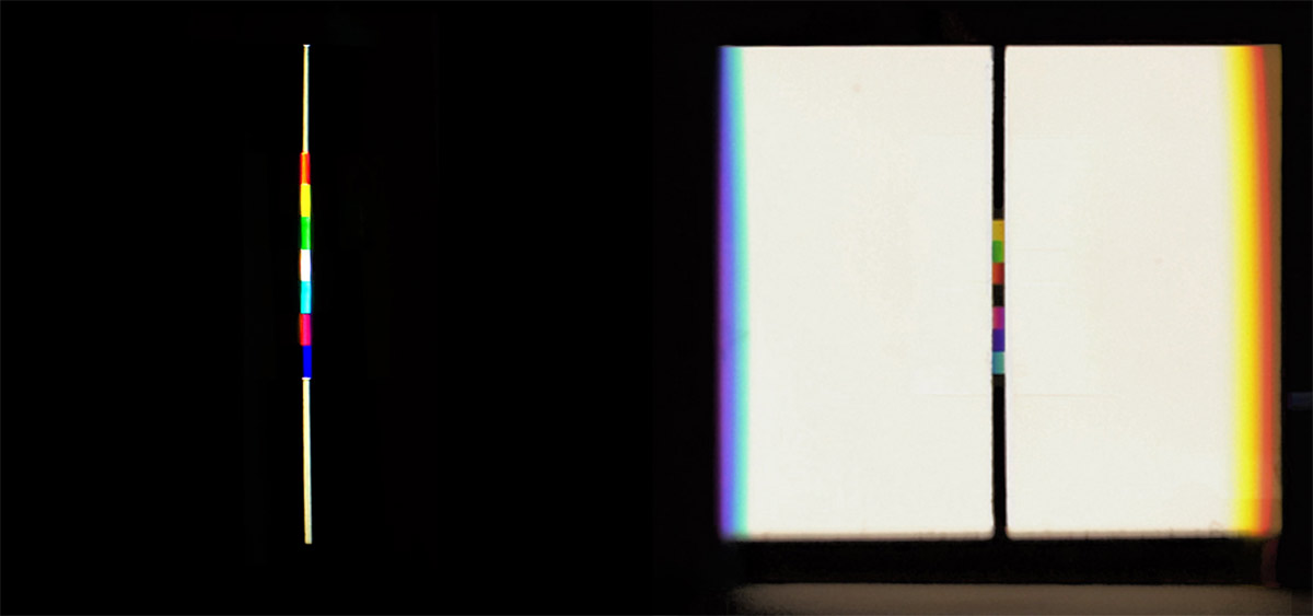 verbreitert (farbig zerstreut), so wird es im Umkehrvorgang – nun vom Standpunkt des Betrachters aus – nach links verengt (farbig gebündelt). Die Art, wie die Teile der Lichtobjekte installiert wurden, erlaubte es, das chromatische Streu- wie Sammelbild mehr oder weniger gleichzeitig in den Blick zu nehmen: Man blickt am Prisma vorbei und auf das Streubild, man blickt durch das Prisma, aber dann auf das Sammelbild. Man hat seine Position dabei nicht verändert. Dies erlaubt einen optimalen Vergleich beider Erscheinungsbilder.