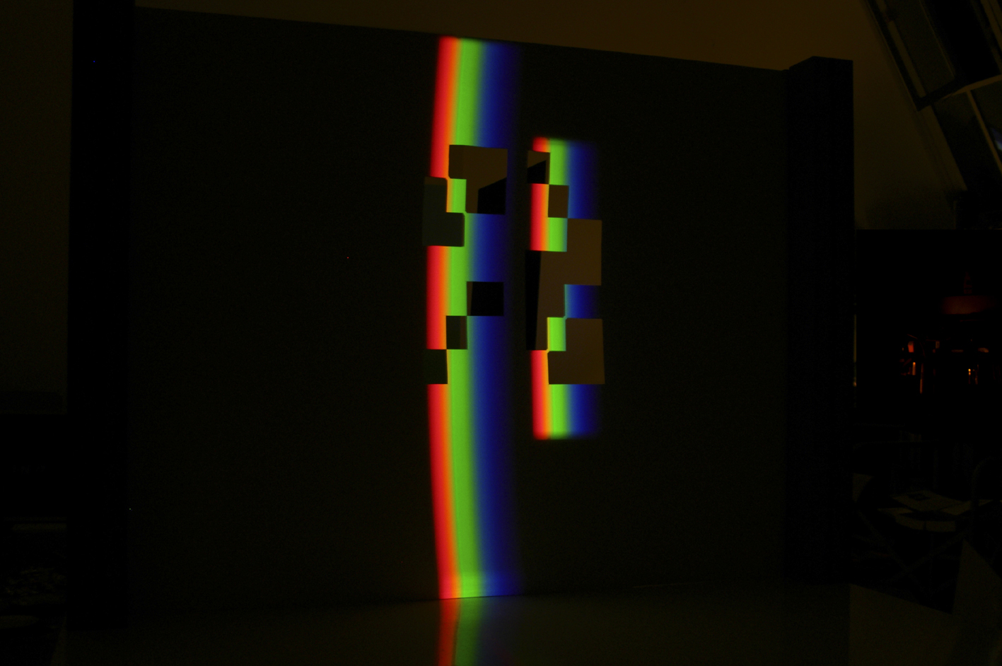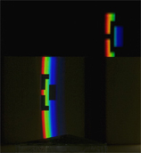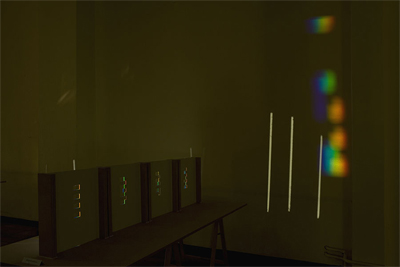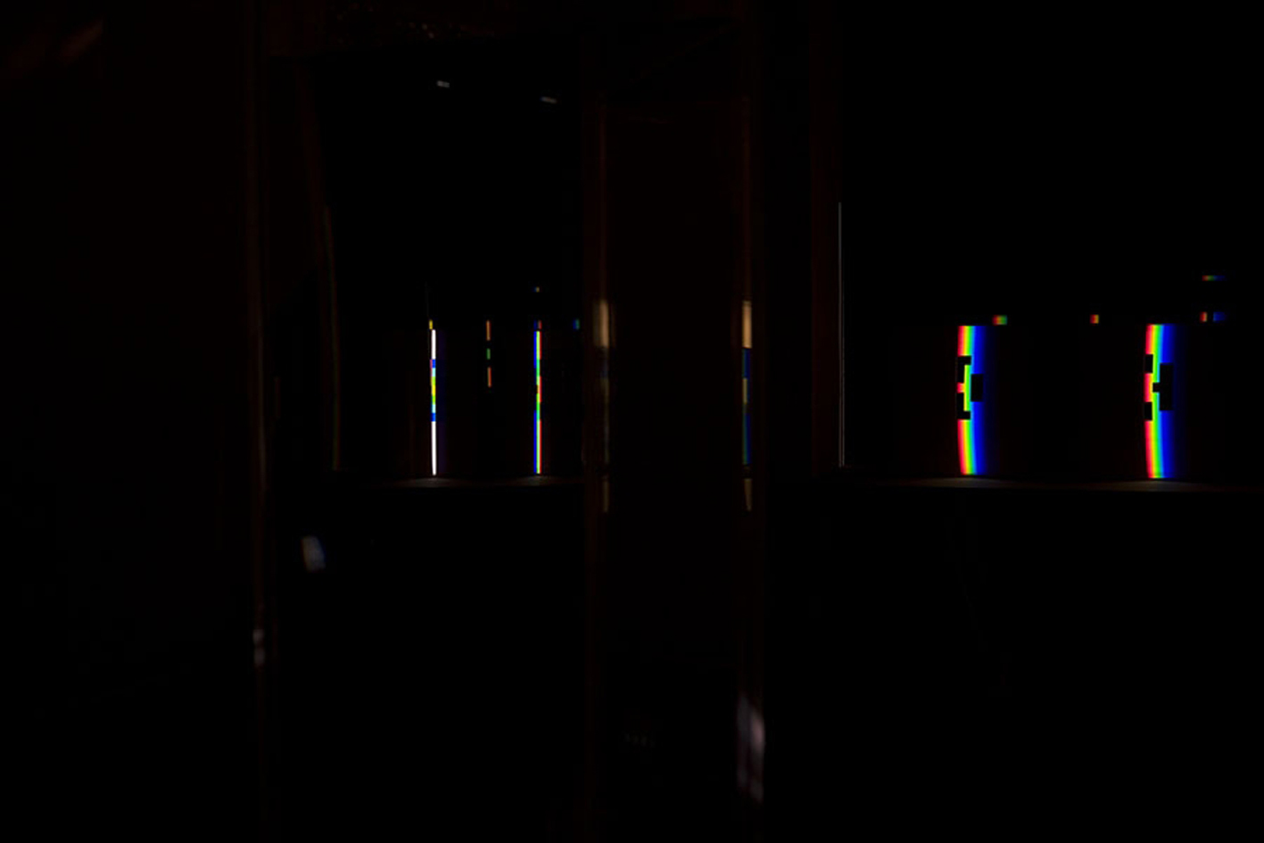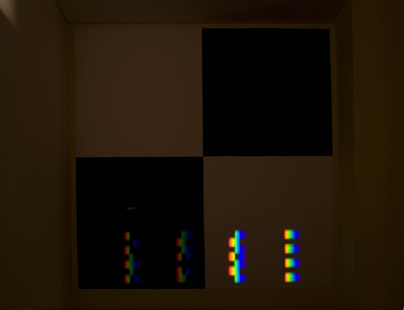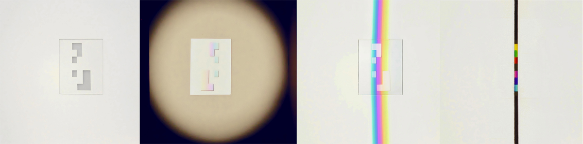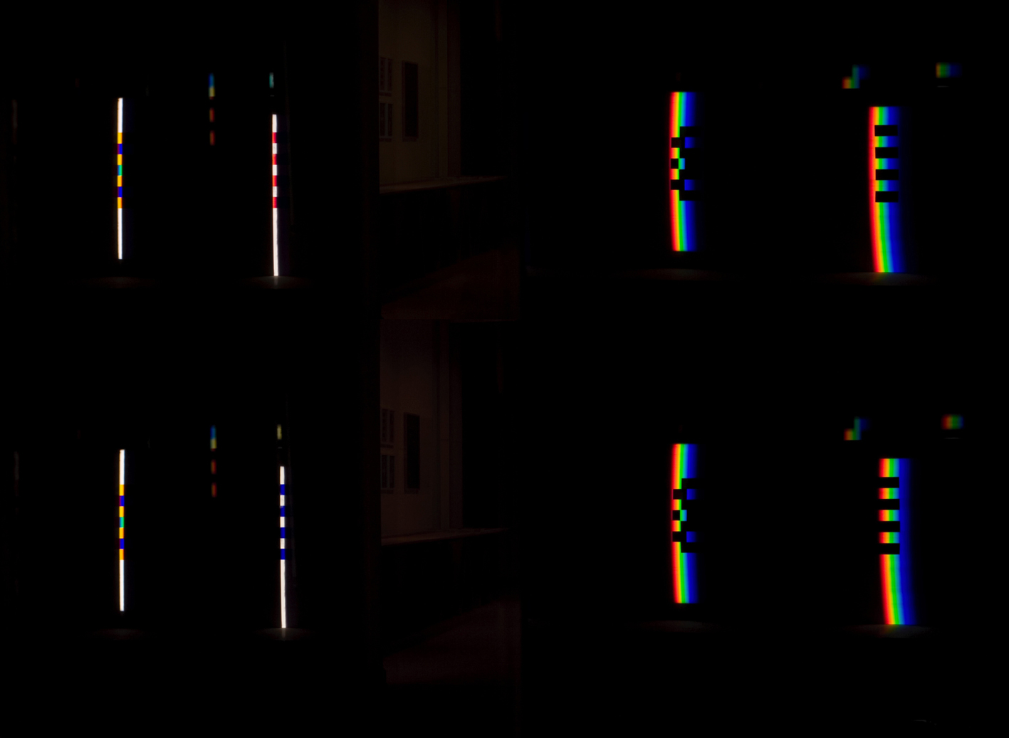 verbreitert (farbig zerstreut), so wird es im Umkehrvorgang – nun vom Standpunkt des Betrachters aus – nach links verengt (farbig gebündelt). Die Art, wie die Teile der Lichtobjekte installiert wurden, erlaubte es, das chromatische Streu- wie Sammelbild mehr oder weniger gleichzeitig in den Blick zu nehmen: Man blickt am Prisma vorbei und auf das Streubild, man blickt durch das Prisma, aber dann auf das Sammelbild. Man hat seine Position dabei nicht verändert. Dies erlaubt einen optimalen Vergleich beider Erscheinungsbilder.