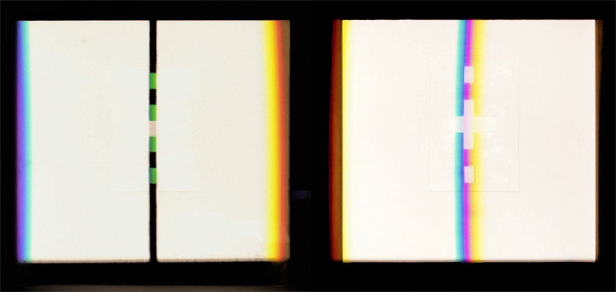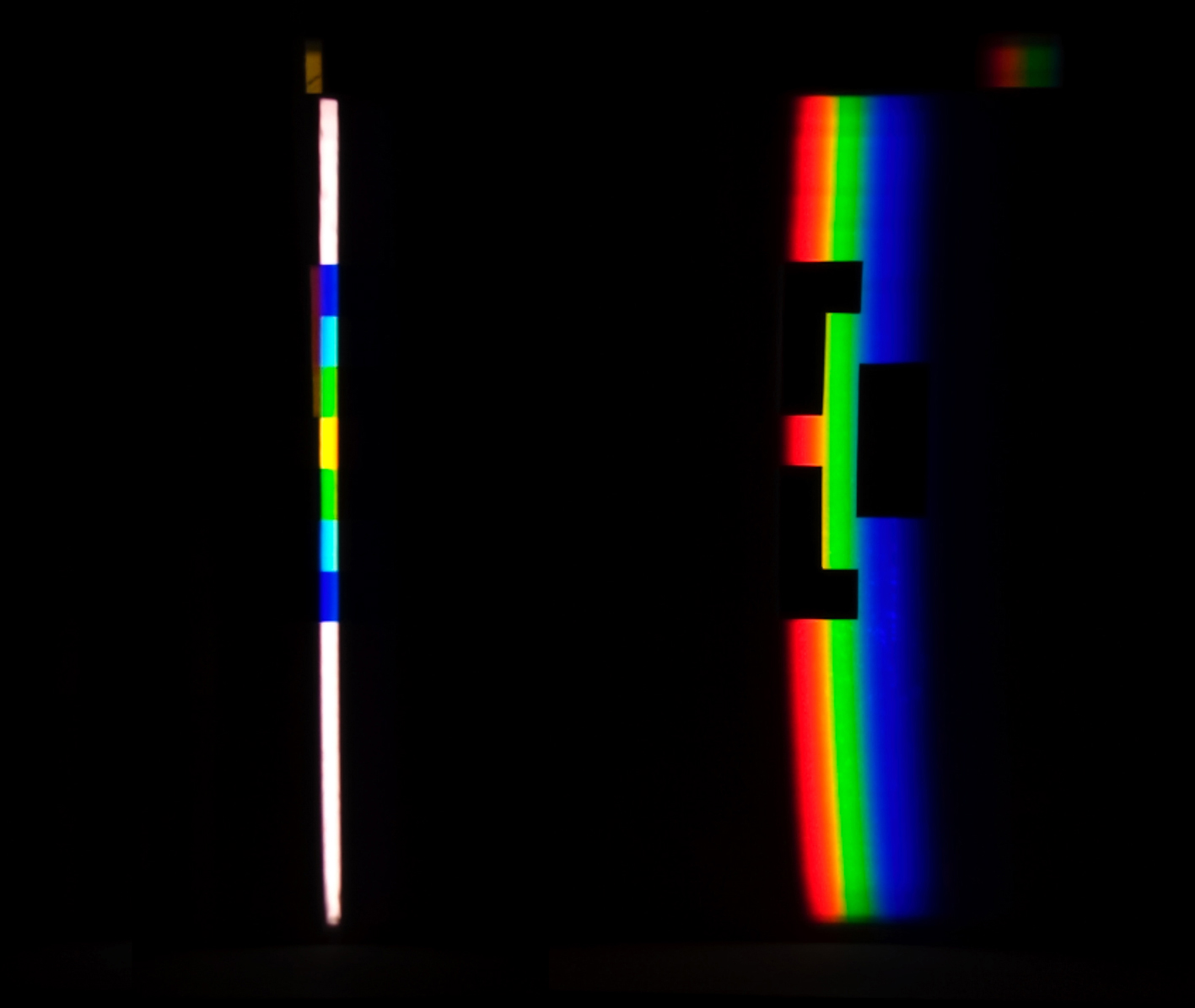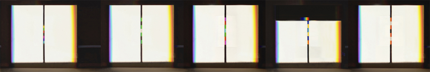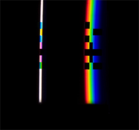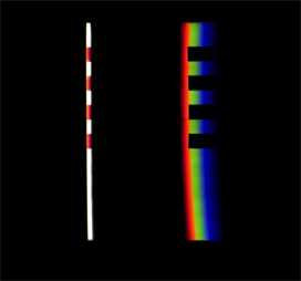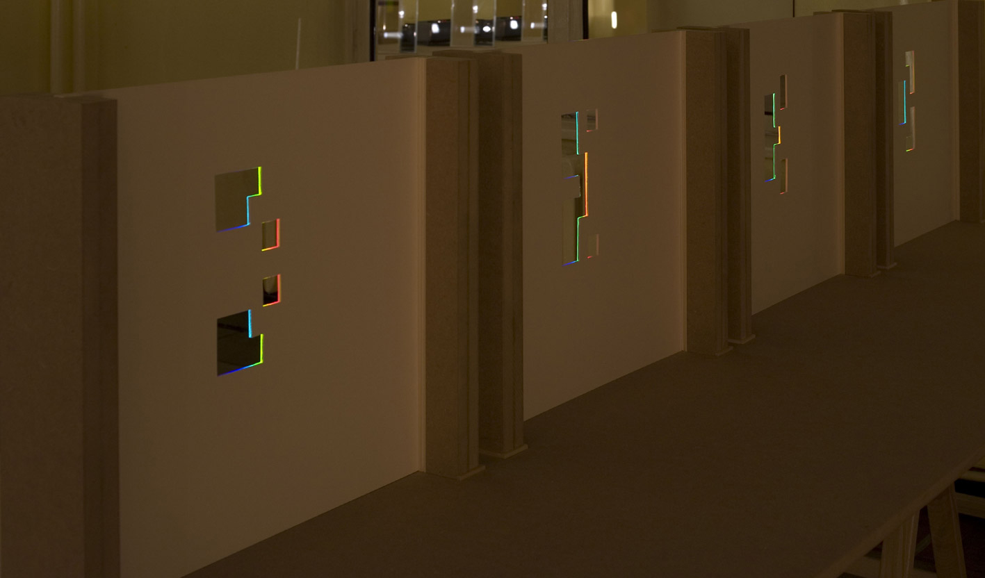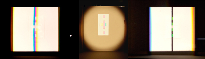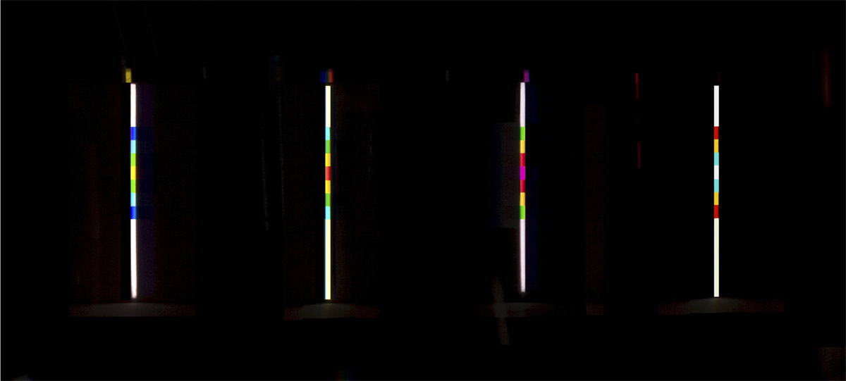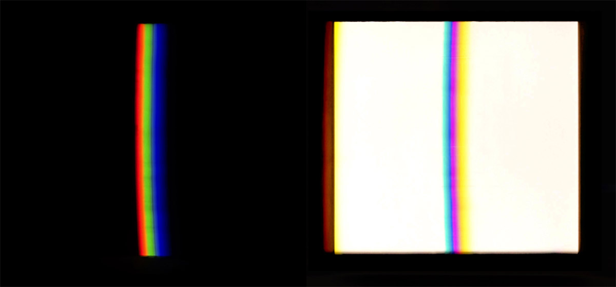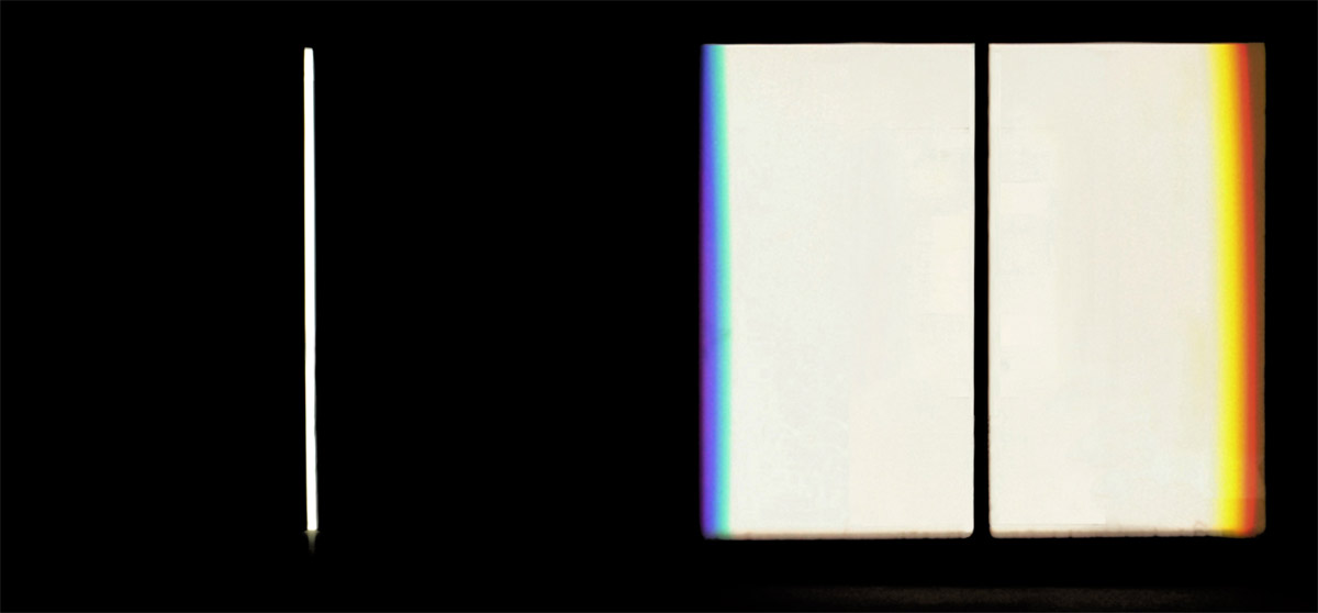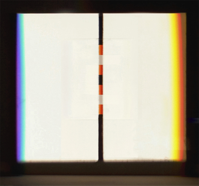 verbreitert (farbig zerstreut), so wird es im Umkehrvorgang – nun vom Standpunkt des Betrachters aus – nach links verengt (farbig gebündelt). Die Art, wie die Teile der Lichtobjekte installiert wurden, erlaubte es, das chromatische Streu- wie Sammelbild mehr oder weniger gleichzeitig in den Blick zu nehmen: Man blickt am Prisma vorbei und auf das Streubild, man blickt durch das Prisma, aber dann auf das Sammelbild. Man hat seine Position dabei nicht verändert. Dies erlaubt einen optimalen Vergleich beider Erscheinungsbilder.