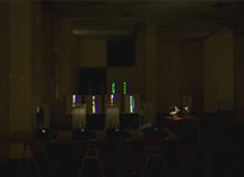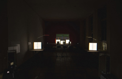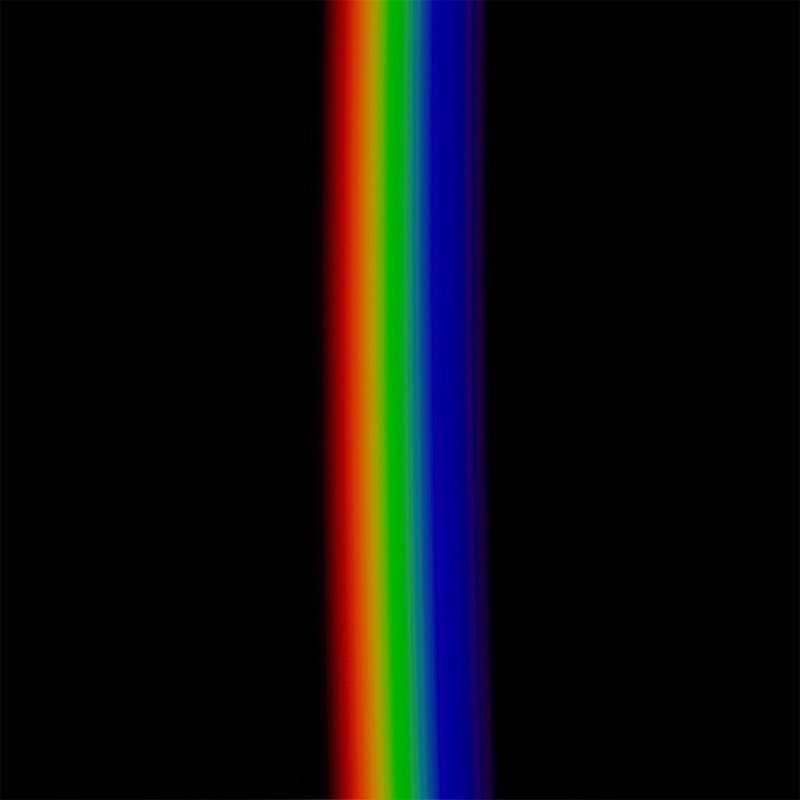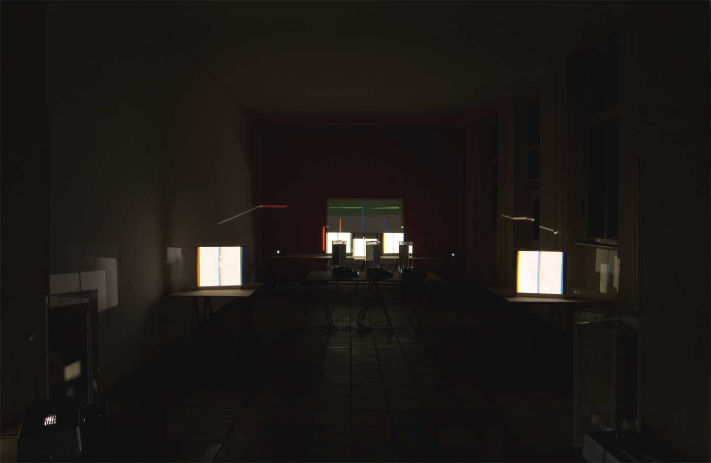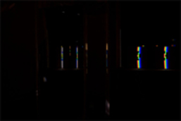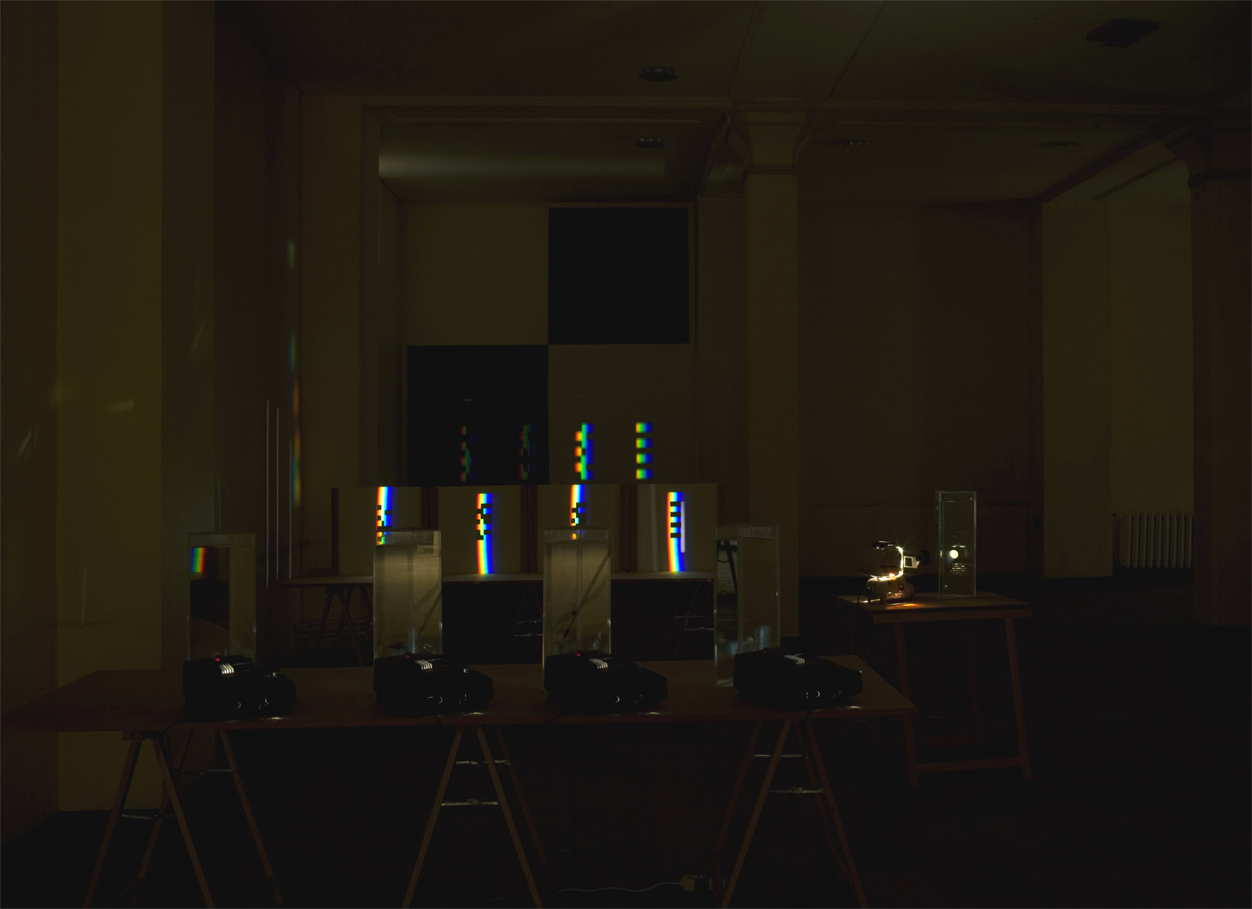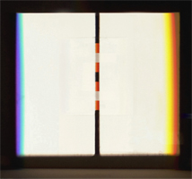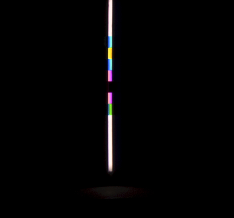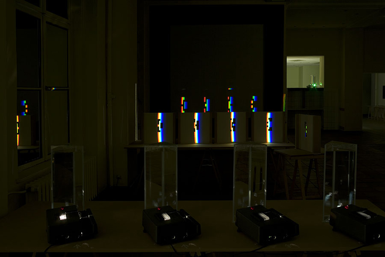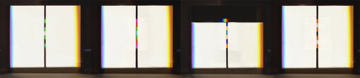 verbreitert (farbig zerstreut), so wird es im Umkehrvorgang – nun vom Standpunkt des Betrachters aus – nach links verengt (farbig gebündelt). Die Art, wie die Teile der Lichtobjekte installiert wurden, erlaubte es, das chromatische Streu- wie Sammelbild mehr oder weniger gleichzeitig in den Blick zu nehmen: Man blickt am Prisma vorbei und auf das Streubild, man blickt durch das Prisma, aber dann auf das Sammelbild. Man hat seine Position dabei nicht verändert. Dies erlaubt einen optimalen Vergleich beider Erscheinungsbilder.