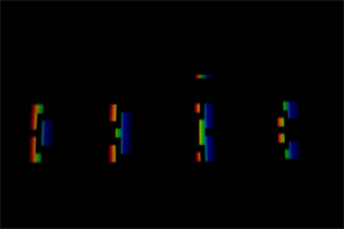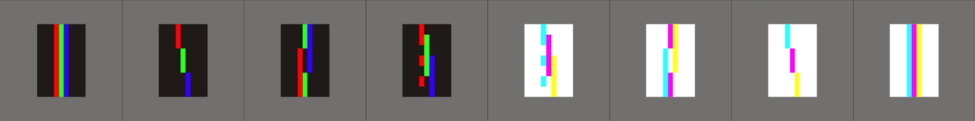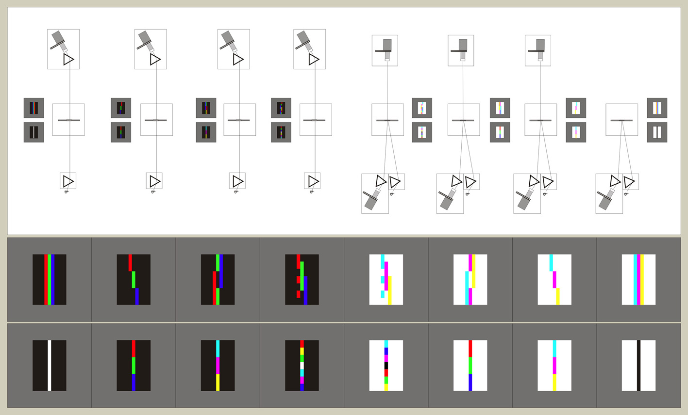 auf der virtuellen Bildebene (dem Restituierungsbild) ein neuer Gegensatz, der für den ganzen Vorgang der Folge typisch ist: der Gegensatz zwischen vollständiger und unvollständiger Lichtaddition der im Spektrum enthaltenen Farben, d.h. der Gegensatz zwischen Weiß (W = R + G + B) und Cyan (C = G + B), Magenta (M = R + B), Gelb (Y = R + G). Die diverse Brechung (bloße Verrückung) der einzelnen Farben R, G, und B ist darin inkludiert, wird vollständig in Stab #3 und Stab #4 und unvollständig in Stab #2 vorgeführt.