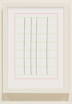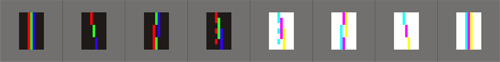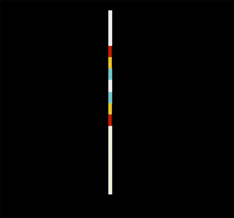 (2) So zeigt Lichtstab #3 (Abb. 40) eine Gliederung oder Struktur, in der keine bunten Leerstellen mehr anzutreffen sind. Alle 7 Felder des Musters sind mit bunten Werten ausgefüllt. Der Gegensatz von ausgefüllt und unausgefüllt ist hier überwunden. Durch Stab #3 und im Verhältnis zu Stab #2 konstituiert sich aber ein neuer Gegensatz zwischen vollständiger und unvollständiger Buntfüllung bzw. zwischen unterbrochener und ununterbrochener Buntgliederung. Zudem belässt Lichtstab #3 die vier roten Felder von Stab #2 als Rahmenraster und fügt nur neue Werte in die Pausen oder Lücken ein. Es findet sich eine Korrespondenz zwischen Stab #2 und #3, obgleich sich ein Gegensatz im Gemeinschaftsbild der Stäbe ausdrückt.