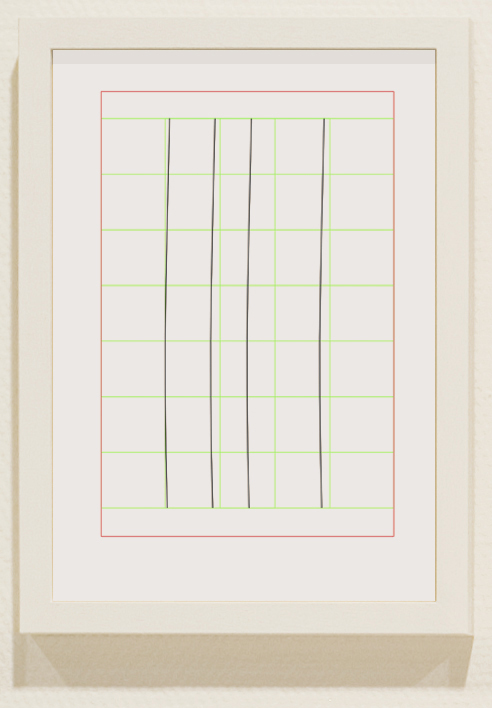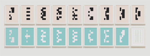 (» Abb. 8). Die Realisierung des Konzepts in die Objekte musste die Bedingungen der Räume berücksichtigen. Diese Bedingungen modifizierten partiell das Grundkonzept, wie es im grafischen Bild der Schablonen veranlagt wurde. Die Realisierung verlieh der Serie eine bestimmte Gestalt, ein bestimmtes Aussehen, eben jene serielle Bildgestalt, die im folgenden näher erläutert und verdeutlicht wird.