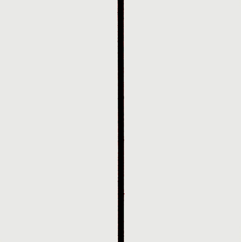 (1) Abb. 39 zeigt Lichtstab #2, der von 4 gleich großen roten Feldern im gleichen Abstand ihrer Größe zueinander rhythmisch untergliedert wird. Er zeigt in seiner verschobenen Mitte ein Muster von 7 deckungsgleichen Feldern, die sich in den Stab führen und ihn seriell strukturieren, ihn mit Feldern gleicher Gestalt und Größe aufschliessen, ihn regelmäßig segmentieren. Die Segmentierung des Stabes erfolgt (nach den Leitfiguren) in einem Muster von 7 deckungsgleichen Feldern, wobei sich allerdings 3 dieser Felder zu Zwischenräumen, Intervallen, Lücken oder Pausen deklarieren, da sie sich mit dem weißen Licht des Stabes (mit der Grundfigur) optisch koordinieren bzw. optisch zur Deckung bringen. Der Eindruck einer optischen Pause bildet sich eben, da diese Felder sich qualitativ von der Grundfigur des Stabes nicht abheben, d.h. auch: sich mit dieser identifizieren. In diesem Sinne veräußern sie bunte Leerstellen [die noch aufzufüllen wären, siehe (2)]. Der Lichtstab formuliert den einfachen Gegensatz von bunt (hier: rot) und unbunt (hier: weiß), zeigt eine Struktur von 4 gleichen Farben mit regelmäßiger Unterbrechung ihrer Folge und verdeutlicht aus dem einfachen Gegensatz von bunt und unbunt, den Gegensatz von Ton und Pause (Buntton und Buntpause im Verhältnis von 4 : 3), wobei das Rot als beliebig erachtet werden könnte. Rot ist aber die erste Farbe des Spektrums und so auch die erste bunte Farbe, mit der die Serie der Stäbe beginnt.