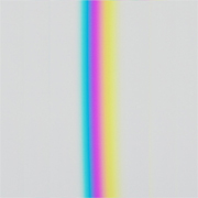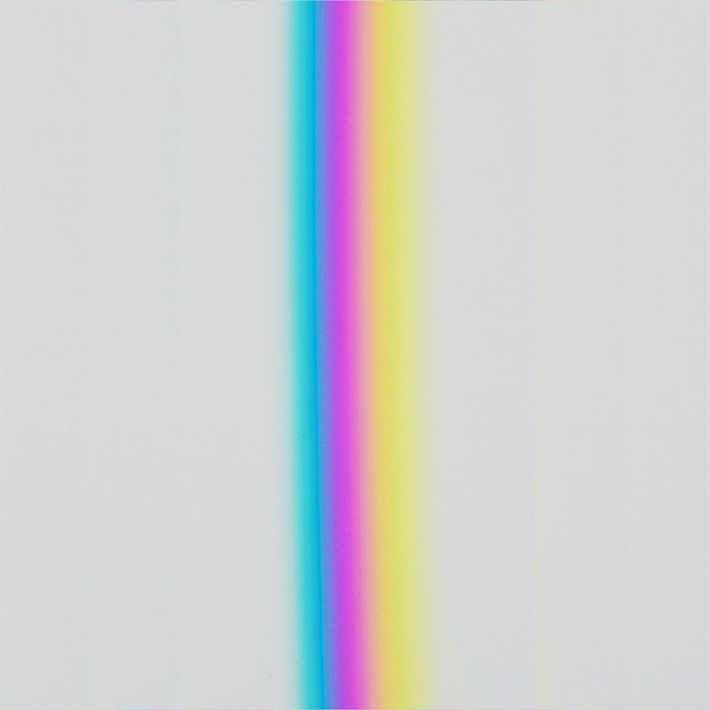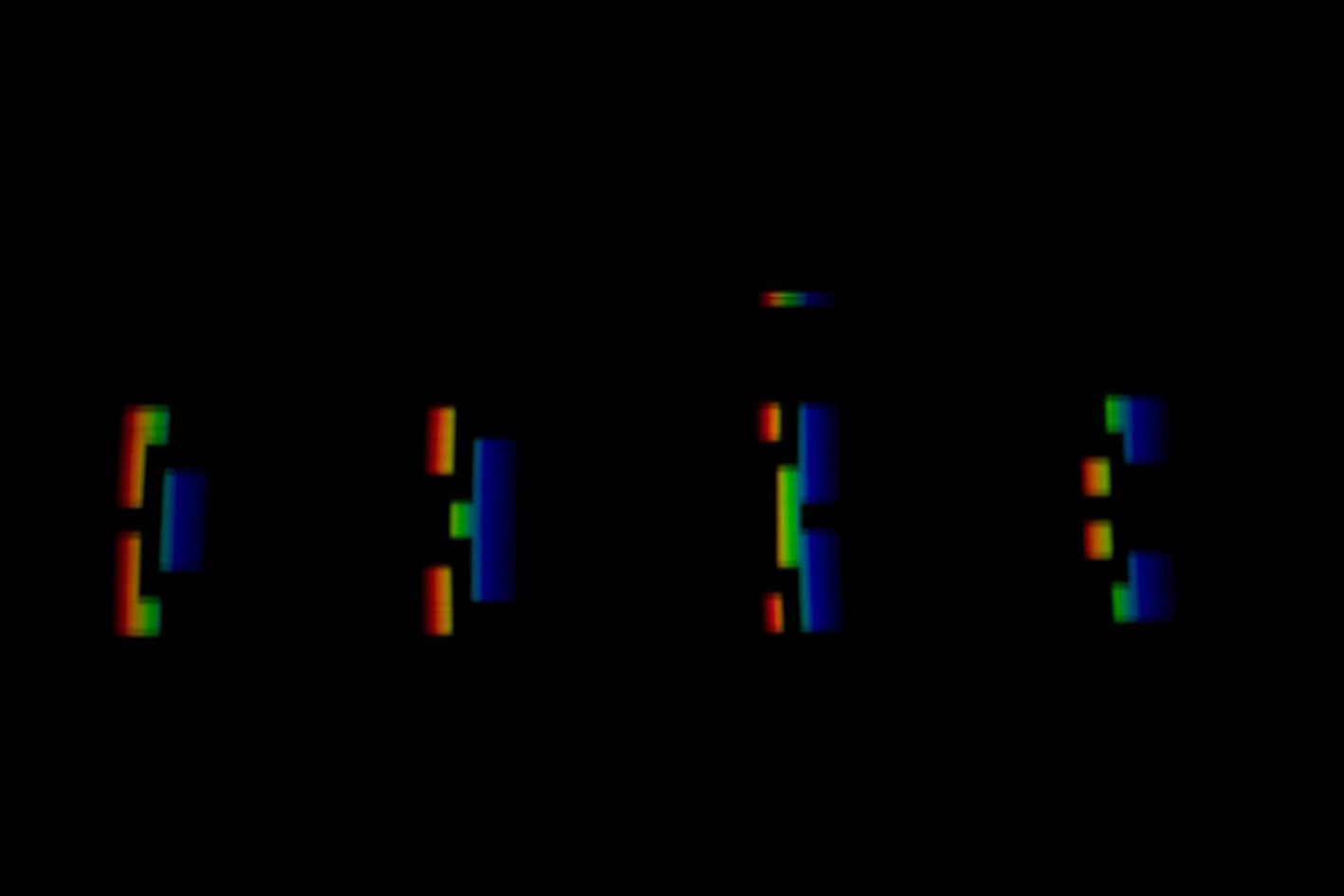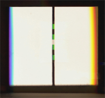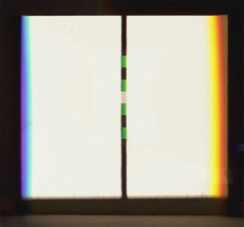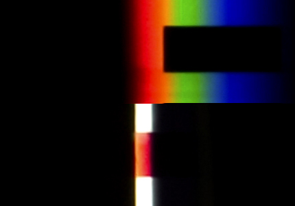 Trotzdem haftet ihnen weiterhin ein Mangel an, der sich wie folgt kurz bezeichnen lässt: Das Gelb des Goethespektrums zeigt sich nicht in voller Sättigungsstufe wie etwa das Gelb des Kantenspektrums; desgleichen zeigt sich auch nicht das Blau des Newtonspektrums mit voller Leuchtkraft, wogegen es im Kantenspektrum eine unverkennbar höhere Brillanz aufweist; und ebenso lässt sich sagen, dass auch Magenta im Goethespektrum keinen vollen Sättigungsgrad zum Ausdruck bringt. Purpur oder Magenta erreicht seine volle Sättigungsstufe ausschliesslich in einem umgekehrten Spektrum, dessen Steg breiter als der in der Ausstellung benutze ist. [Zum Vergleich von Spektren aus verschiedenen Spalt- und Stegbreiten (» Abb.4) siehe auch » Historie] Dieser (beiden Spektren anhaftende) Mangel lässt sich aber – so paradox es vielleicht klingen mag – via unvollständiger Bildrestituierung beheben: Indem Teile aus der Farbmannigfaltigkeit der Spektren ausgesondert werden, holt sich das Fehlende an Farben im Vereinigungsbild der spektralen Farbfragmente wieder ein. Das klingt beinahe wie eine wunderbare Farbvermehrung: Man nimmt etwas vom Ganzen der Erscheinungsmannigfaltigkeit weg und fügt (auf zweiter Ebene) damit dem Ganzen etwas hinzu. Damit verdeutlicht sich im Bildungsvorgang eine Struktur des Offensichtlichen (Aktuellen) und Möglichen (Potentiellen) und zudem thematisiert sich das komplexe Feld von Grundfarben und Mischfarben oder von einfachen (simple colours) und zusammengesetzten Farben (compound colours). Neutraler wäre von der Farbbasis und den Farbfolgen der Spektren sprechen.