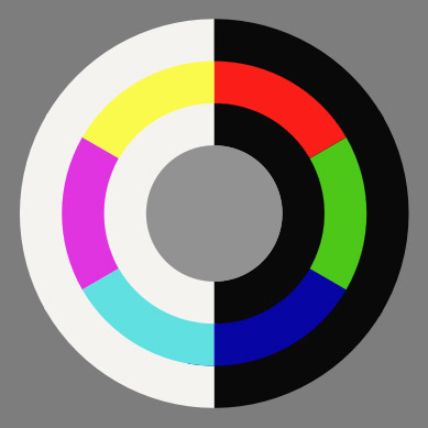 [R-W-R-W-R-W-R] etabliert den Gegensatz zwischen bunt und unbunt, Buntton und Buntpause in einem regelmäßigen Wechselbild: B-U-B-U-B-U-B.
