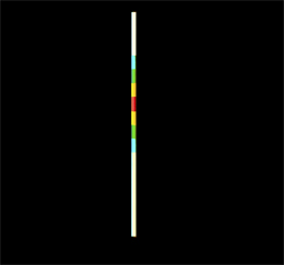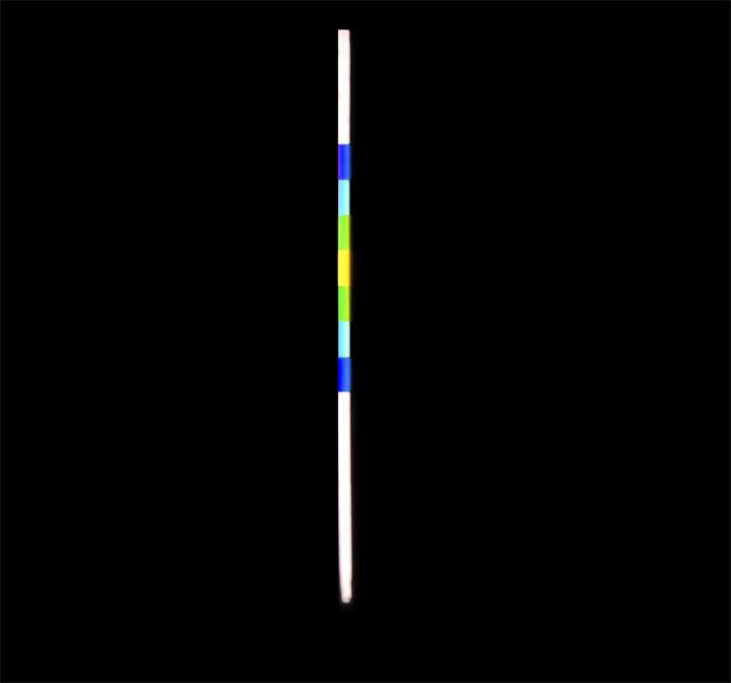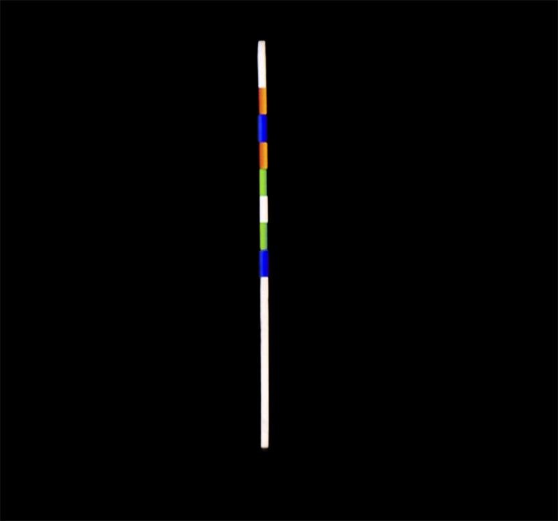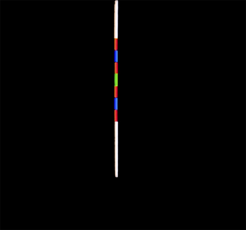 Er zeigt im obersten Feld 4 Farben (von rechts nach links): Rot, Gelb, Grün und Blau im kontinuierlichen Übergang. Die materielle Struktur des Stabes lässt sich wie folgt notieren: BGYR-B-Y-C-Y-B-R. Blendet man die ersten Farben BGY der