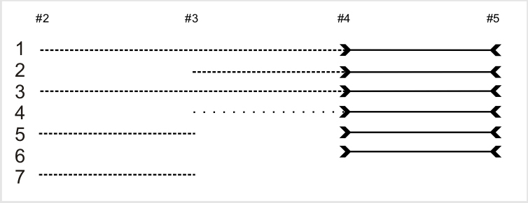 [C-Y-C-M-S-M-G] antwortet auf die in Stab #4 eingehaltene Beschränkung (Restriktion), nur jene Farben [R, G, B, W] zu verwenden oder einzusetzen, die auch in Stab #2 und Stab #3 verwendet wurden, erstens mit einer Erweiterung (Extension): auch solche Farben zu verwenden, die in keinen der bisherigen Stäbe enthalten sind [C, M, Y, S] und zweitens mit einem radikalen Wechsel: alle Farben, die in den beiden Tripelmustern R-B-R und G-W-G enthalten sind, gegenbildlich auszu-tauschen [R-B-R >> C-Y-C und G-W-G ® M-S-M]. Damit entwirft sich in den Tripelmustern von Stab #5 ein komplemen-täres Gegenbild zu allen in den Tripelmustern in Stab #4 enthaltenen Farben. Hinsichtlich der der Folge der Tripelmuster tritt bei vollständiger Imitation der formalen Struktur (x-y-x-z-w-z) vollständige Variation (Innovation) ihrer materiellen Struktur