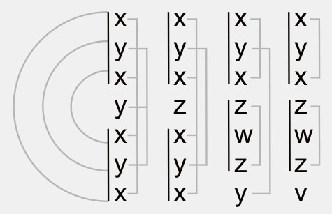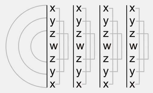 ersten Zeile aus, so ergibt sich die Folge: R-B-Y-C-Y-B-R, welche sich der formalen Struktur nach mit Stab #12: x-y-z-w-z-y-x identifiziert.