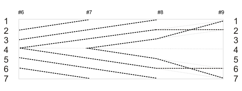 [R-Y-C-W-C-Y-R] variiert (bricht) das Variationsprinzip ohne das ursprüngliche und regelmäßig wechselnde Helldunkelbild zu verlieren: D-H-D-H-D-H-D. Stab #9 hebt den komplementären Gegensatz von Zentrum und Peripherie auf, belässt einen Wert von Stab #8 am gleichen Ort in Stab #9 (Y an den Stellen b und f) und schiebt einen zweiten Wert doppelt nach außen fort (R von c nach a und von e nach g).
