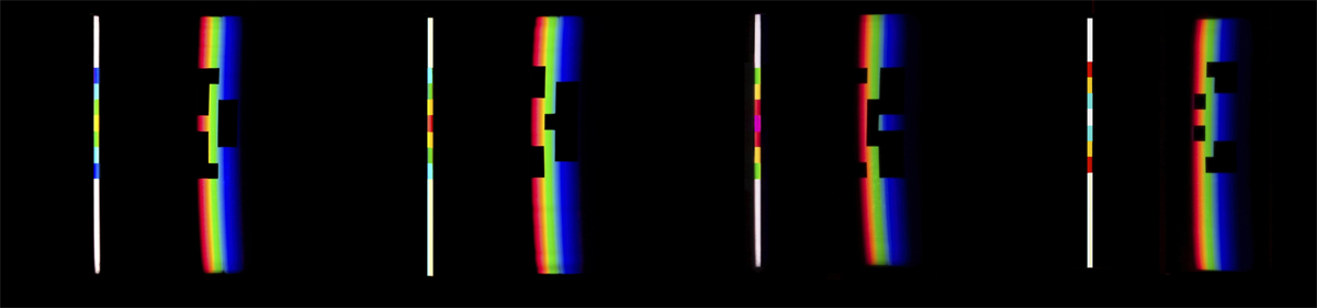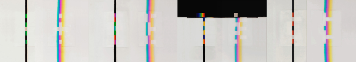 Überhaupt sind beide Bildebenen: vollständiges und unvollständiges Spektrum (= reelle Bildebene, Bildebene Nr. 1) vollständiges und unvollständiges Restituierungsbild (= virtuelle Bildebene, Bildebene Nr. 2) beständig im Auge zu behalten, um den mit der Serie gekoppelten Prozess nachvollziehen zu können. Im phänomenologischen Nachvollzug stellt sich ein Zusammenhang der Bilder her. Was man sieht wird registriert und gekoppelt. So sieht man etwa, dass der grüne und blaue Abschnitt des Spektrums an bestimmter Stelle ausgesondert oder hindurchgelassen wird und der rote Abschnitt auf der Auffangschablone verbleibt. Der rote Abschnitt wird rechts durch die Kante der Öffnung in der Schablone scharf begrenzt,