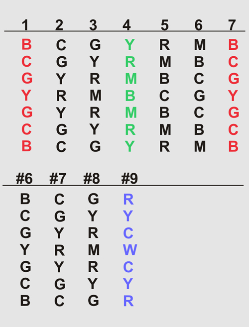 Die einzelnen Farbnamen werden im Folgenden zur einfachen Kennzeichnung durch die Großbuchstaben R, G, B, C, M, Y, W, S abgekürzt. Bereits in Stab #3 taucht das Tripelmuster zweimal auf, nämlich oben und unten. Hier wie folgt notiert: an erster und letzter Stelle R-B-R-G-R-B-R, wobei die Wiederholung des Musters durch Unterstreichung hervorgehoben wird. Es wiederholt sich das Tripelmuster T-M-T seiner materiellen Struktur nach, seinem Farbmuster R-B-R nach. Dies führt im Folgenden zu einigen Unterscheidungen, welche der Betrachtung nützlich sind: