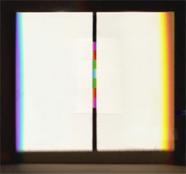 Weißer Lichtstab und schwarzer Schattenstab bilden die beiden (komplementären) Grundfiguren der Lichtinstallation (Abb. 33). Sie wurden als selbständige Objekte nicht realisiert, sondern waren bloß mittelbar in allen Objekten enthalten. Sie waren imaginär präsent oder wurden vorstellbar, sofern man von der spezifischen Fragmentierung der Spektren absah. Die Grund-figuren bilden sich aus der vollständigen Restituierung des Newton- und Goethespektrums im Blick durch die großen Wasserprismen und stellen damit die wiederhergestellten Einheiten der spektralen Mannigfaltigkeiten des Newton- und Goethespektrums (Abb. 34) vor.