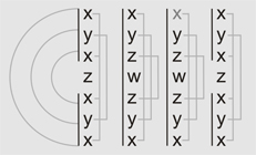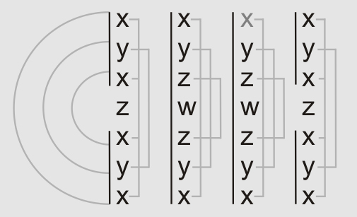 Ein Vergleich der formalen Strukturen der Schattenstäbe #11 - #14 (Abb. 72) ergibt die Gleichheit der beiden äußeren wie inneren Stäbe; dabei wird von der eben geschilderten Variante in Stab #13 abstrahiert (Variable x an Stelle a wurde deshalb in Grau notiert).