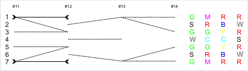 [R-W-R-S-R-W-R] imitiert das in Stab #11 bereits imitierte regelmäßige Wechselbild von bunt und unbunt B-U-B-U-B-U-B, variiert aber die Position der unbunten Kontrahenten S und W, indem er sie dazu invertiert organisiert. Kurz gesagt: Er ersetzt G durch R, S durch W und W durch S. Außerdem wiederholt er das in Stab #2 [R-W-R-W-R-W-R] aufgebaute rote Rasterbild