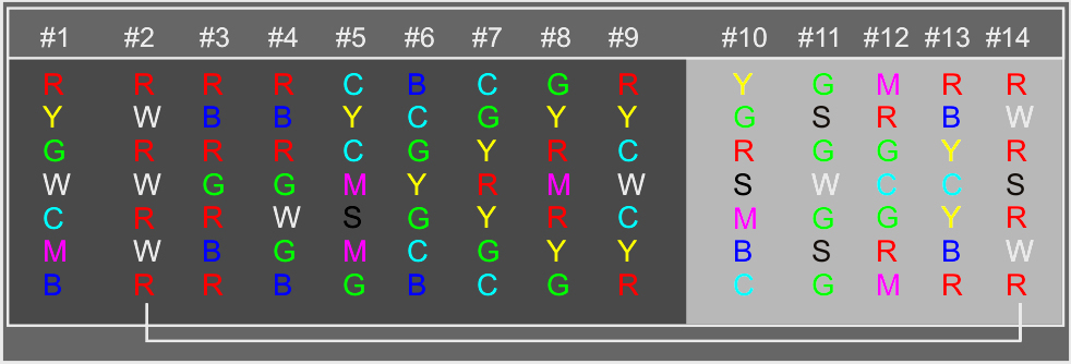 (R-B-R-G-W-G >> C-Y-C-M-S-M) in Kraft, die in Stab #4 nur zum Teil und bedingt geschah. Es rundet sich das Prinzip der Variation in den Tripelmustern ab, ergänzt sich aber noch dadurch, dass auch die Farbe im letzten Feld zum vorletzten